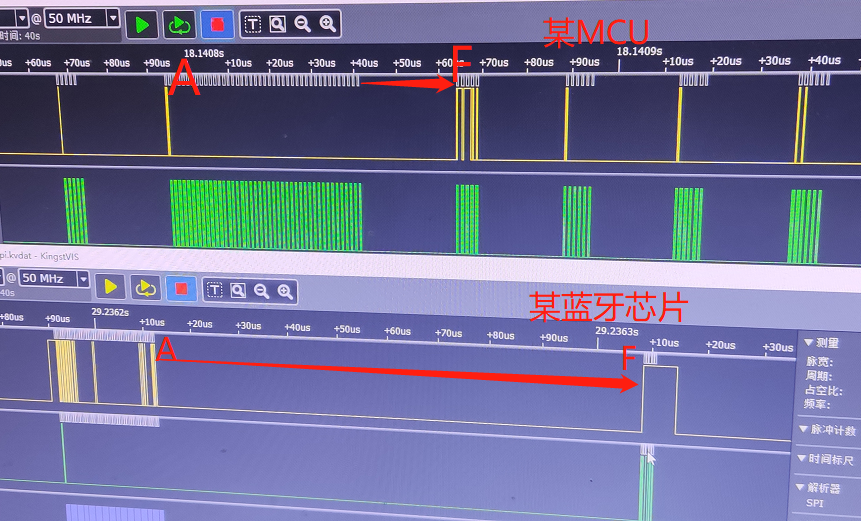 近期的几个问题着实让人头疼,过程也是相当坎坷;1、丢包率硬件的稳定性,软件一样的逻辑,丢包率居高不下,一直在40%以上;还好硬件同事不甩锅,发现硬件PA的问题,重新修改了一版硬件后,确实丢包率下来了好多,还是需要有一般靠谱的伙伴;当然软件这块也做了好多修改,丢包重试;sniffer模式的实现;2、功耗;功耗仪上测试了好几版,抓波形,分析工作时长;分析竞品的工作时长,找到功耗消耗长的原因:第一个:T